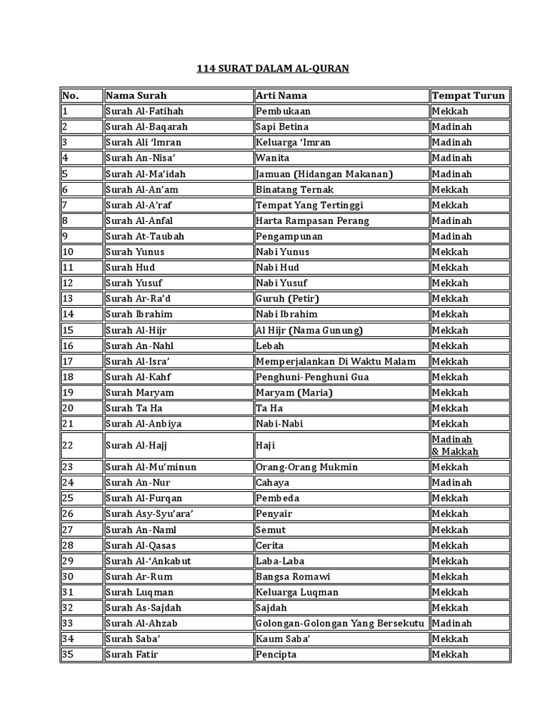 Berikut ini terjemahan asbabun nuzul dan tafsir surat quraisy. 286 ayat tempat turunnya ayat. Surah dalam al qur an dari segi keutamaan dan kemuliaan atau panjang dan pendeknya memiliki kedudukan di mana pembaca dapat mencapainya sedikit demi sedikit. Nama surat arti surat 1 al fatihah pembukaan 2 al baqarah sapi betina 3 ali imran keluarga imran 4 an nisaa wanita 5 al maidah hidangan 6 al an am binatang ternak 7 al araaf tempat tertinggi 8 al anfaal harta rampasan perang 9 at taubah pengampunan 10 yunus yunus 11 hud hud 12.
