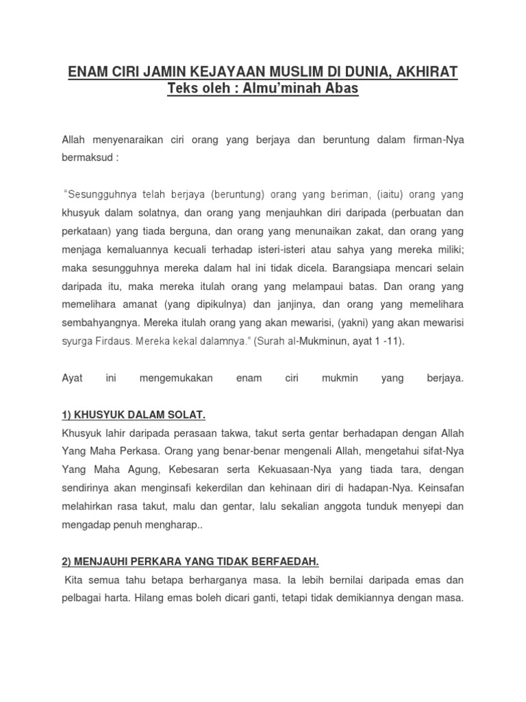 Enam Ciri Jamin Kejayaan Muslim Di Dunia Akhirat Teks Oleh Almu Minah Abas