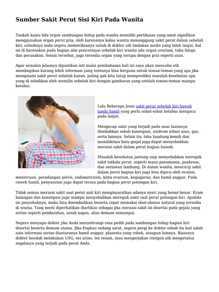 Biasanya sakit perut akibat batu ginjal akan terasa pada bagian kiri bawah dan kemudian menimbulkan nyeri perut sebelah kiri. Selain itu ada juga reaksi lain yang menggambarkan bahwa anda sedang mengalami batu ginjal yakni dengan warna urine yang sedikit gelap serta rasa nyeri pada kelamin. Karena saking luasnya maka pada kesempatan kali ini akan dibahas khusus mengenai sakit perut bagian bawah pada wanita. Pada perut bagian kiri wanita terdapat beberapa organ yang hanya dimiliki wanita seperti ovarium tuba falopi dan rahim.