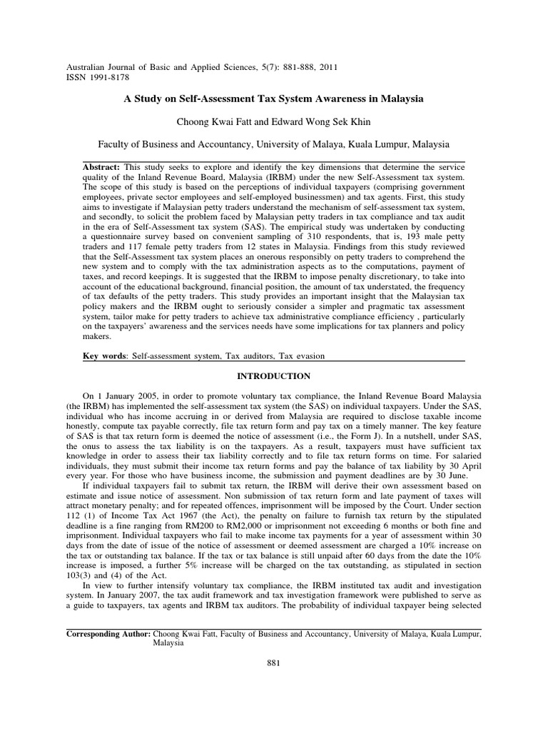 A Study On Self Assessment Tax System Awareness In Malaysia Tax Return United States Taxes Free 30 Day Trial Scribd